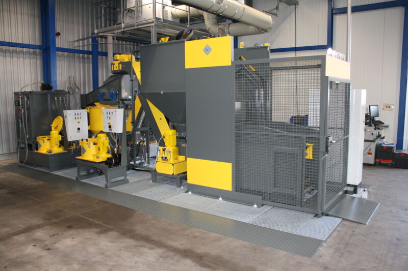- Späneanlagen mit Durchlauf- oder Schubbodenzentrifugen in Kombination mit Hebe-Kipp-Gerät, Spänebrecher, Späneförderer,