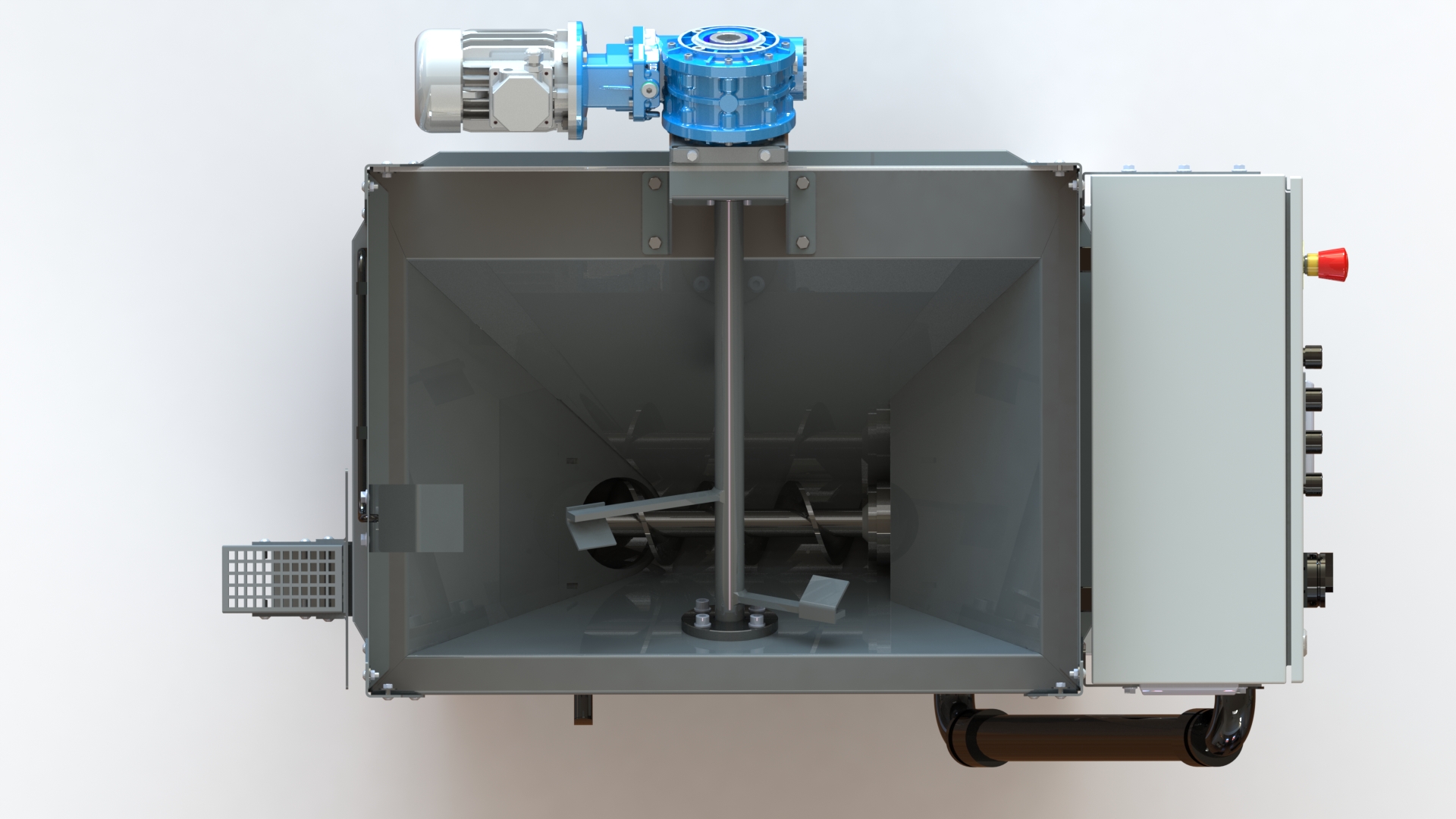 Optional kann der Trichter mit einem Brückenbrecher-Mischer ausgestattet werden, der die Verarbeitung von an den Trichterwänden anhaftenden Materialien ermöglicht. Darüber hinaus ist der EVTM-65-L mit Abflusssystemen für überschüssige Flüssigkeiten ausgestattet, die sonst im Trichter stagnieren würden.