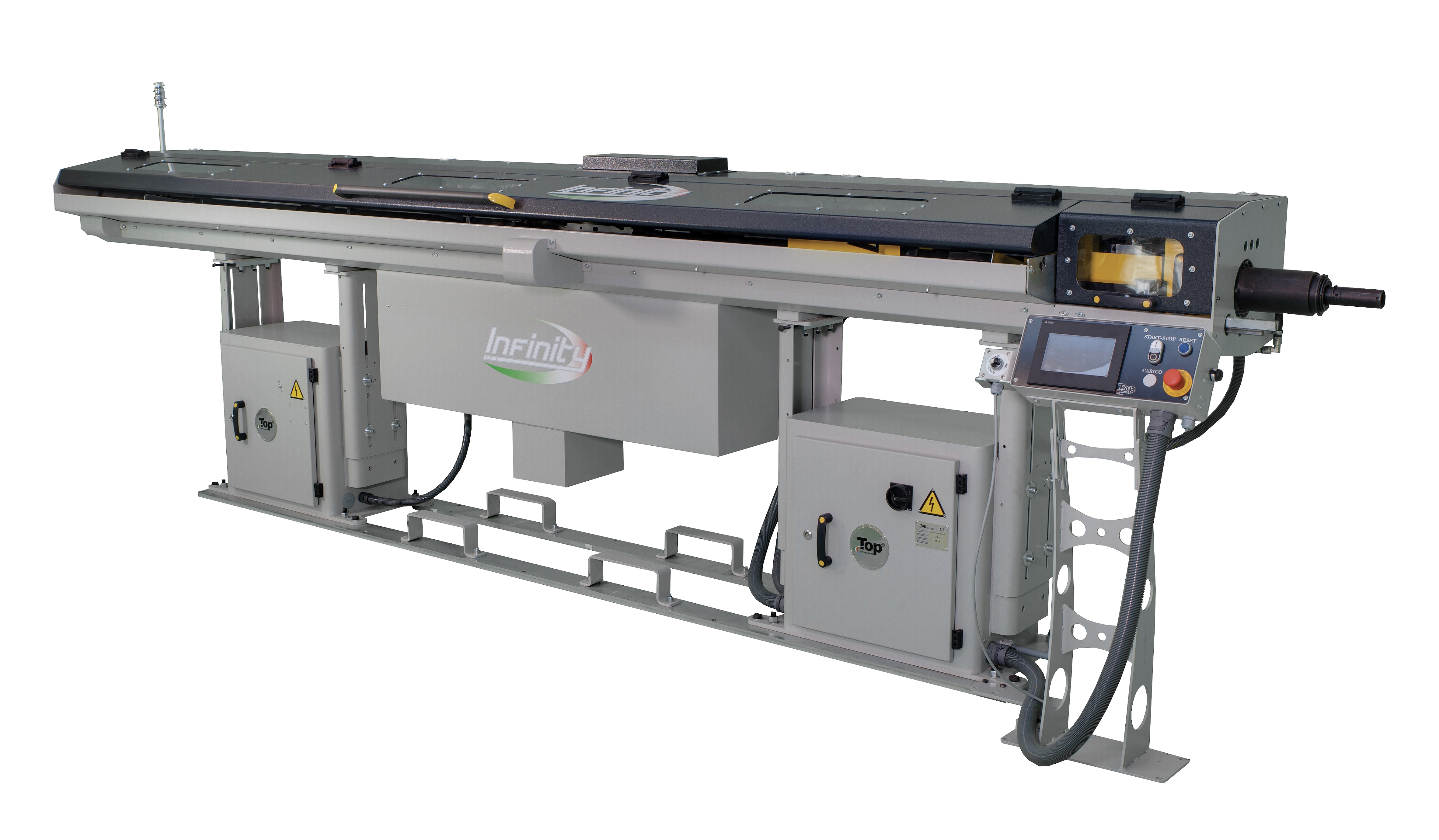 Die Verwaltung des INFINITY- Laders wird mit einer Touchscreen-SPS ausgerüstet. Der Servo-Motor und die integrierten digitalen Magnetventile, steuern die Fahrgeschwindigkeit, die Schubkraft und alle automatisierten Komponenten. Von der SPS aus ist es möglich, den zu bearbeitenden Durchmesser in nur 60 Sekunden umzuprogrammieren.